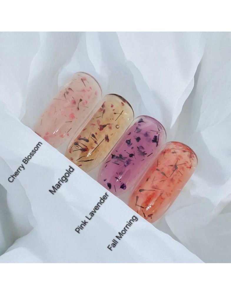 Gelul Fall Morning este un corai translucid cu accente portocalii din florile delicate, inspirat din culorile blânde ale toamnei.