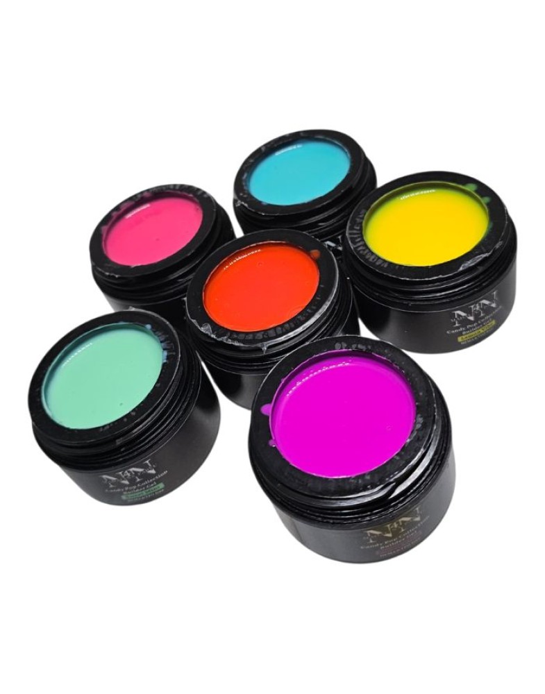 Setul de 6 geluri Builder Candy Pop conține: Blue Breeze, Electric Pink, Lemon Vibe, Orange Glow, Purple Glow, Sweet Mint, nuanțe perfecte pentru vară și combinații vibrante.