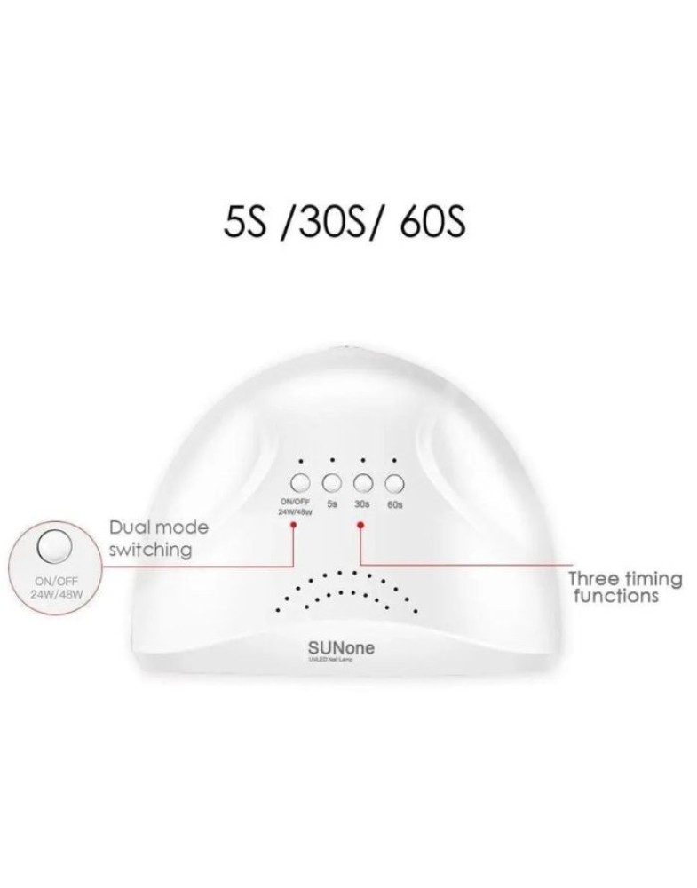 Una dintre caracteristicile distinctive ale lămpii UV/LED pentru uscat unghii, SUN One, este versatilitatea sa notabilă. Aceasta asigură uscarea eficientă a unei game variate de materiale, incluzând geluri UV, acrilice, oje semipermanente, shellac și biogeluri. Această versatilitate inspiră încredere utilizatorilor, indiferent de tipul de material utilizat, pentru a obține rezultate perfecte.
