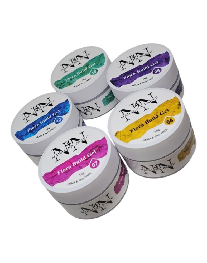 Setul Flora Builder Gel include 5 nuanțe, 04, 07, 08, 10,12, perfecte pentru tehnicienele care vor manichiuri luminoase, vibrante.